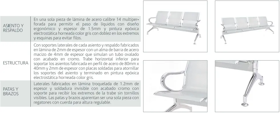 La banca es estructuralmente fuerte y resistente, fabricada con materiales duraderos y de alta calidad para soportar un uso continuo. Suele contar con un diseño elegante y funcional que se integra fácilmente en cualquier ambiente. Además, puede estar tapizada en materiales fáciles de limpiar y mantener, lo que la convierte en una opción práctica para espacios de alto tránsito.